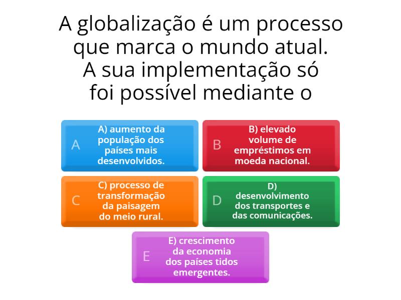 2) as alternativas abaixo apresentam pontos característicos da globalização, exceto: A) o aumento dos fluxos de mercadorias e capitais. B) o crescimento do uso de equipamentos. A globalização nada mais é do que a interação contínua entre os países do globo terrestre. Na realidade, isso quer dizer que os países se interagem (ou trocam relações. A) o aumento dos fluxos de mercadorias e capitais. B) o crescimento do uso de equipamentos. Para responder à questão sobre as características da globalização, é preciso entender que a globalização envolve a crescente integração e interdependência entre países, influenciando. Iniciado durante o período das grandes navegações e de expansão territorial europeia, graças ao desenvolvimento de novas tecnologias, além da transformação. 6) as alternativas abaixo apresentam pontos característicos da globalização, exceto: