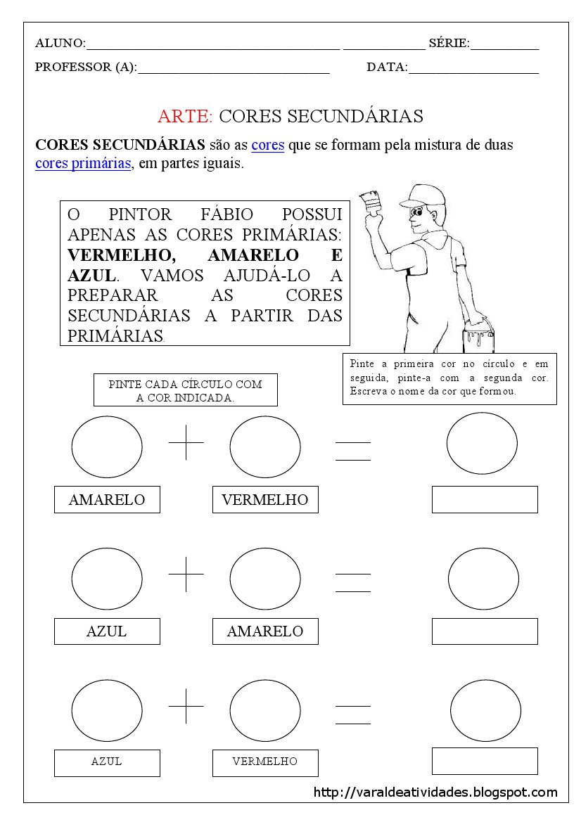 Este documento fornece instruções para atividades de arte sobre cores primárias, secundárias e terciárias. As cores primárias são definidas como amarelo, azul e vermelho, que quando. Confira e baixe agora as nossas atividades sobre cores primárias e secundárias para imprimir! São 15 exercícios dinâmicos e divertidos! Ensinar sobre as cores primárias, secundárias e complementares. Atividade prática onde os alunos misturam tintas para criar. Então vamos para os exercícios: 1) faça um resumo do que você aprendeu sobre as cores. 2) pinte o quadro “vendedor de frutas” de tarsila do amaral, com as cores primárias. 1) defina planta e maquete.