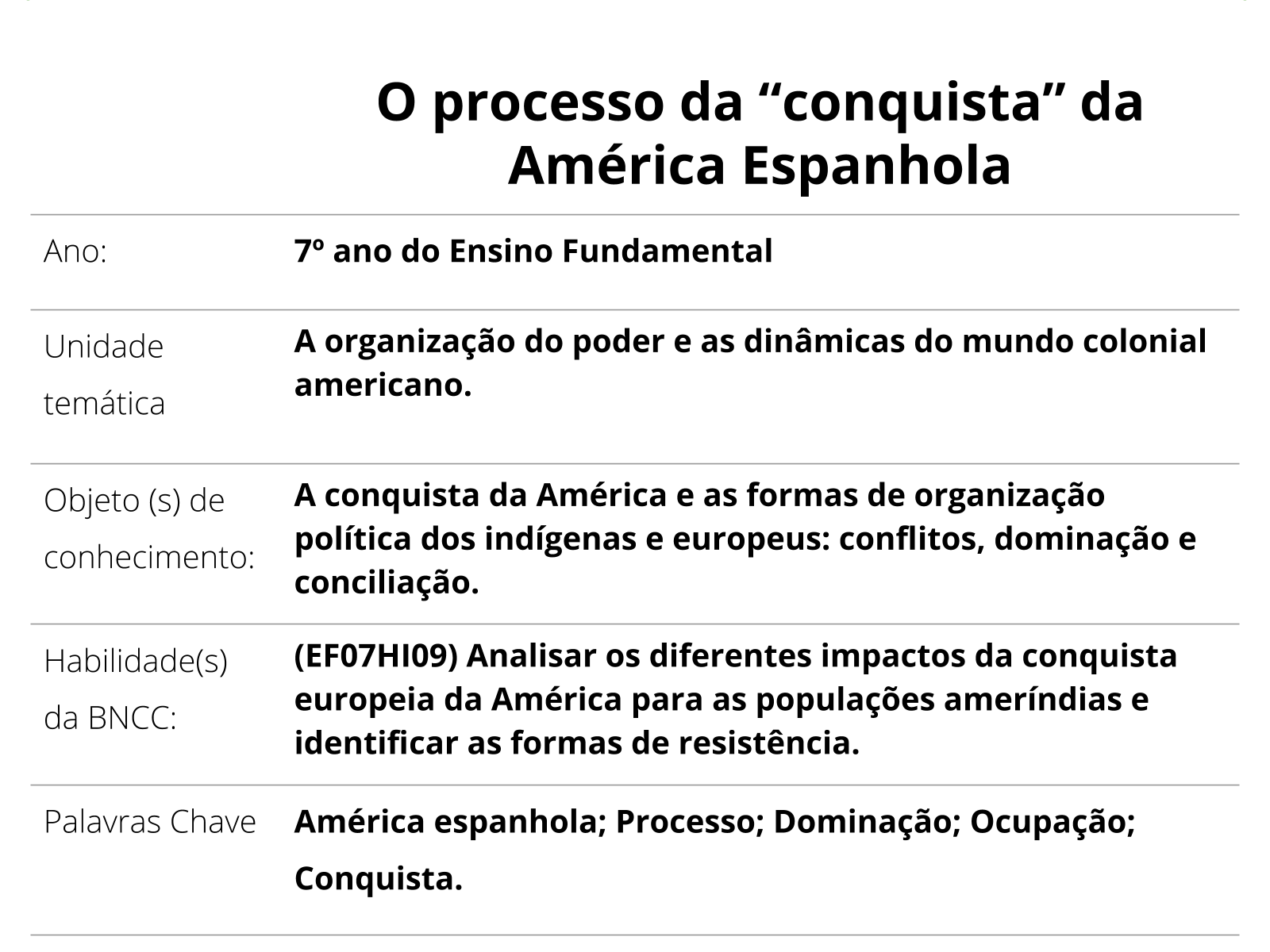 (a) a aceitação pacífica da conquista pelos nativos, causada pelo medo dos conquistadores. (b) a superioridade bélica dos europeus e o uso do cavalo, que causou espanto aos povos. Acompanha exercícios e um infográfico para ser preenchido pelos alunos. (ef07hi02) identificar conexões e interações entre as sociedades do novo.