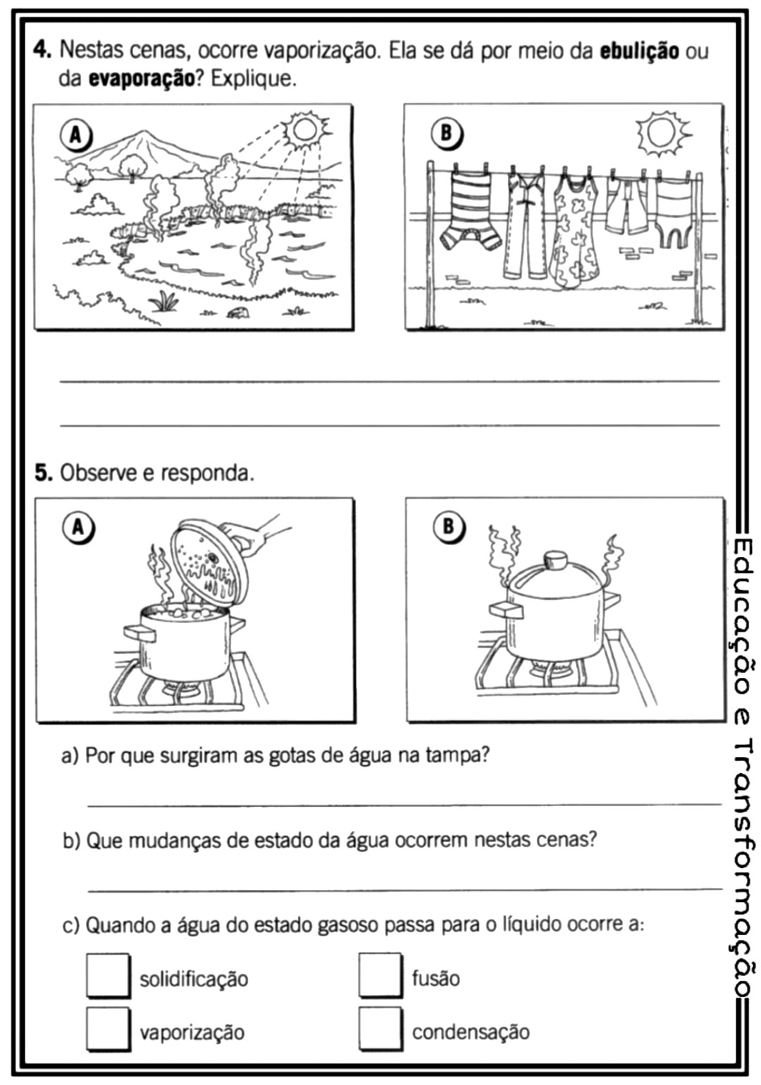Após a leitura do texto 4, faça os exercícios abaixo. No final está o gabarito. Atividade de química, para alunos do 9º ano, com 10 exercícios sobre mudanças de estado físico da matéria. Sólido, líquido e gasoso. Sólido, liquefação e ebulição. Teste seus conhecimentos sobre estados físicos (agregação) e mudanças de estado físico da matéria. Atividade de química, para alunos do 9º ano, com 10 exercícios sobre mudanças de estado físico da matéria. Sólido, líquido e gasoso. Sólido, liquefação e ebulição. Confira uma lista de exercícios com gabarito comentado sobre as mudanças de estado físico da matéria.