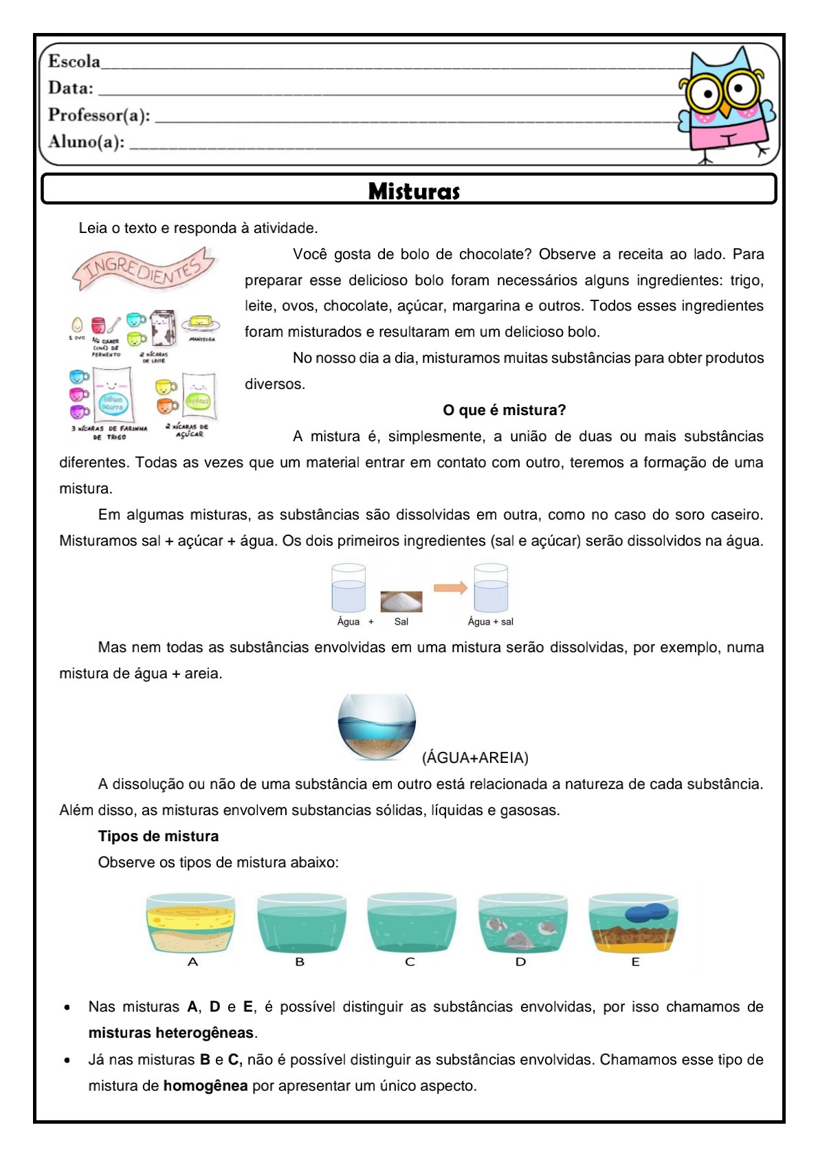 Atividades Sobre Misturas Homogêneas E Heterogêneas 6o Ano Com Gabarito