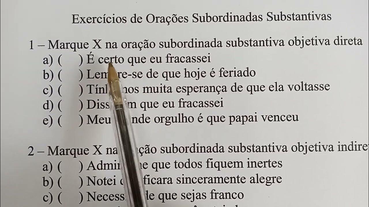 Classifique as orações subordinadas substantivas abaixo: A) é preciso que cada um assuma suas responsabilidades. B) confesso que sua visita me surpreendeu. Gabarito dos exercícios sobre orações subordinadas substantivas: B) funciona como sujeito, objeto direto, objeto indireto, ou complemento do verbo. A) o marido gritou que estava cheio das brigas da. Neste exercício, serão abordadas questões que desafiam o candidato a reconhecer e interpretar orações subordinadas substantivas de maneira prática. O foco será na identificação da função. (ucmg) há oração subordinada substantiva apositiva em: Onde poderemos falar à vontade?