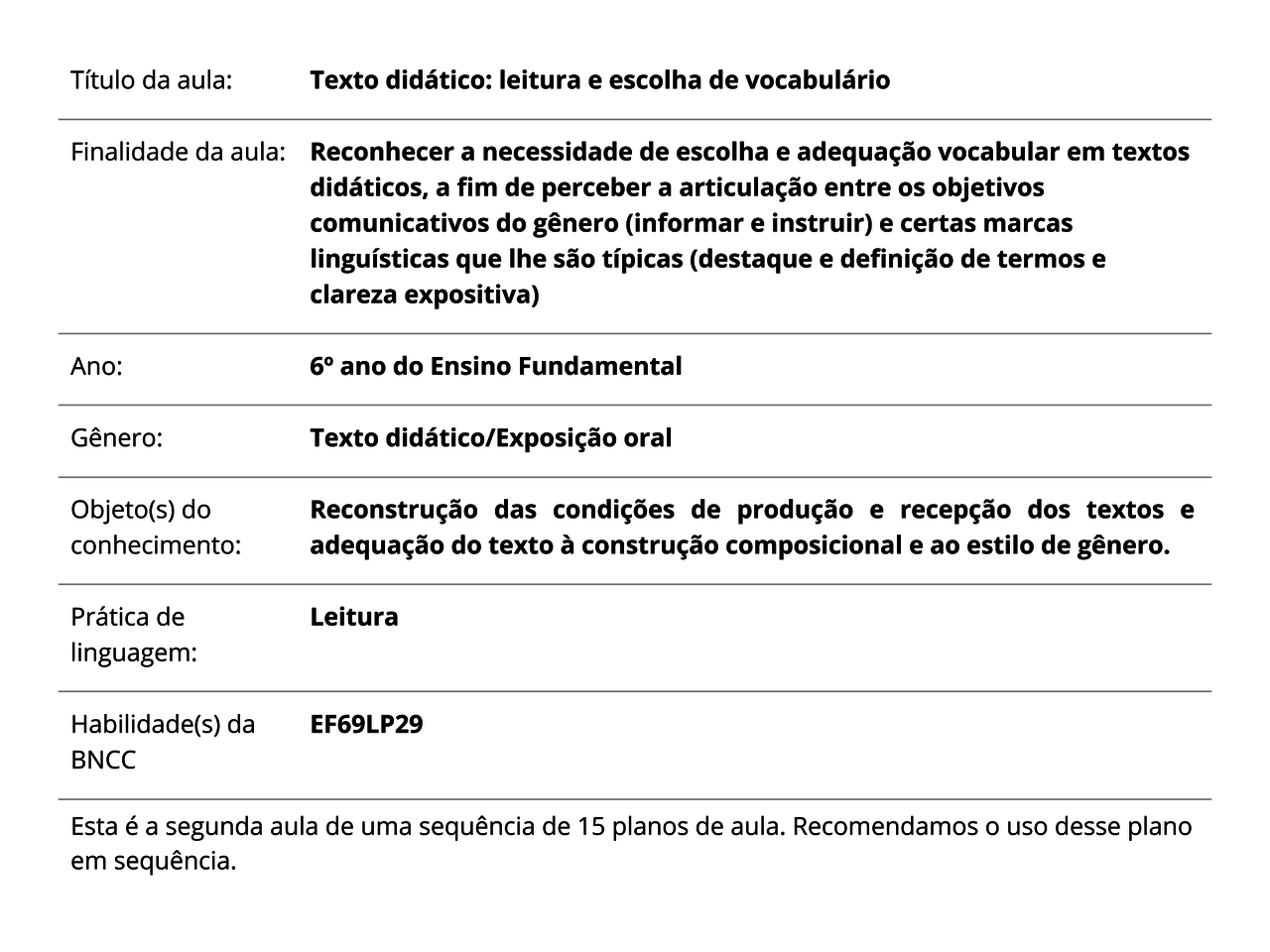 Plano de Aula - 6º ano - Língua Portuguesa - Texto didático: leitura e